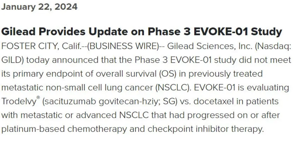 2024年1月22日,Gilead公布Trop2 ADC新药Trodelvy治疗非小细胞肺癌的三期临床EVOKE-01研究没有达到OS主要终点。EVOKE-01正在评估Trop2 ADC药物Trodelvy®(sacituzumab-govitecan-hziy;SG)与多西他赛在铂类化疗和检查点抑制剂治疗期间或之后进展的转移性或晚期NSCLC患者中的疗效。