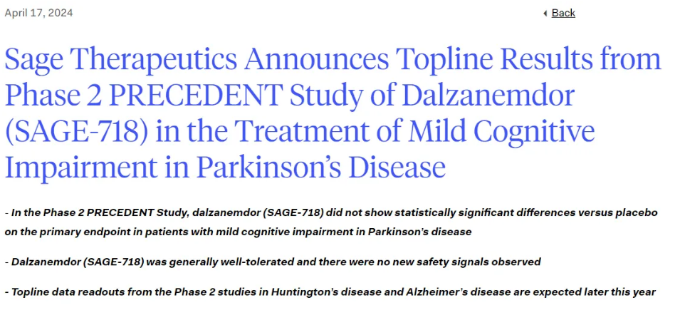 4月17日,Sage Therapeutics宣布一项针对帕金森病 (PD) 轻度认知障碍 (MCI) 患者的研究性口服药物dalzanemdor (SAGE-718) 的双盲、安慰剂对照2期研究PRECEDENT研究的初步结果未达到主要终点,即在第42天时接受每日一次dalzanemdor治疗的患者与接受安慰剂治疗的患者在WAIS-IV编码测试得分方面与基线相比不存在显著统计学差异。Dalzanemdor (SAGE-718)的耐受性总体良好,没有发现新的安全信号。