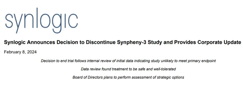 终止Synpheny-3试验的决定是基于即将进行的独立数据监测委员会(DMC)评估前的内部审查结果,该结果表明该试验不太可能达到主要终点。该决定并非基于对安全性或耐受性的担忧。Synlogic现在将与相关的Synpheny-3临床试验机构合作,执行终止试验的决定。