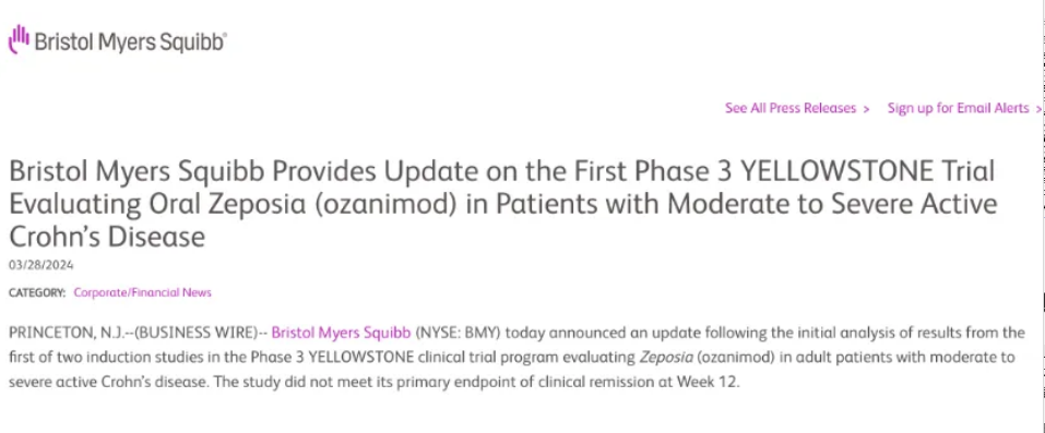 3月28日,BMS宣布1-磷酸鞘氨醇 (S1P) 受体口服小分子调节剂 Zeposia(ozanimod),治疗中重度活动性克罗恩病患者的安慰剂对照临床III期试验YELLOWSTONE研究失败,在第12周未达到临床缓解的主要终点。