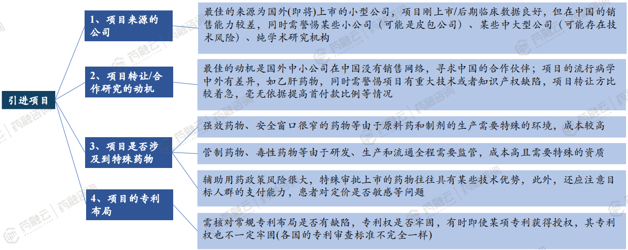 最佳的动机是国外中小公司在中国没有销售网络,寻求中国的合作伙伴;项目的流行病学中外有差异,如乙肝药物,同时需警惕项目有重大技术或者知识产权缺陷,项目转让方比较着急,毫无依据提高首付款比例等情况。