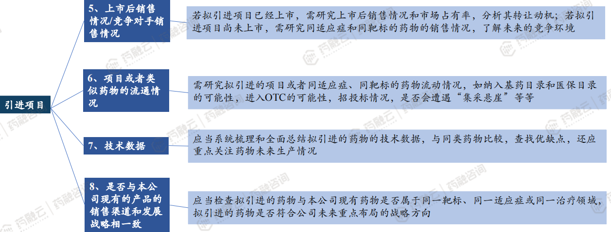 若拟引进项目已经上市,需研究上市后销售情况和市场占有率,分析其转让动机;若拟引进项目尚未上市,需研究同适应症和同靶标的药物的销售情况,了解未来的竞争环境。