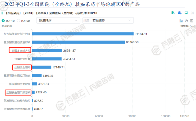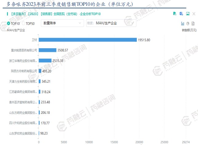 多奈哌齐2023年前三季度销售额TOP10的企业中,卫材、锐恩医药和华海药业位列前三。