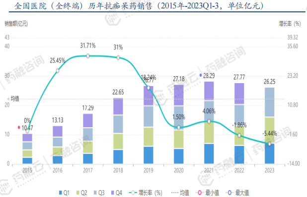 全国医院(全终端)历年抗痴呆药销售(2015年-2023Q1-3,单位亿元)