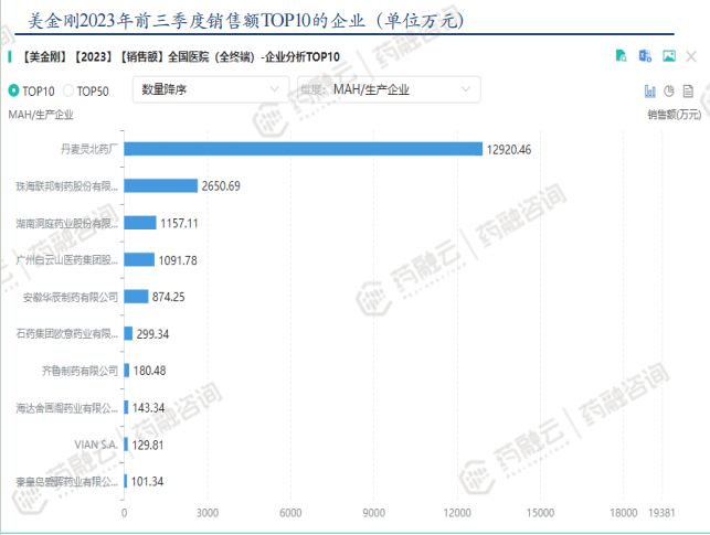 据摩熵医药数据库显示,美金刚2023年前三季度销售额TOP10的企业中,丹麦灵北制药、联邦制药、洞庭药业位列前三。