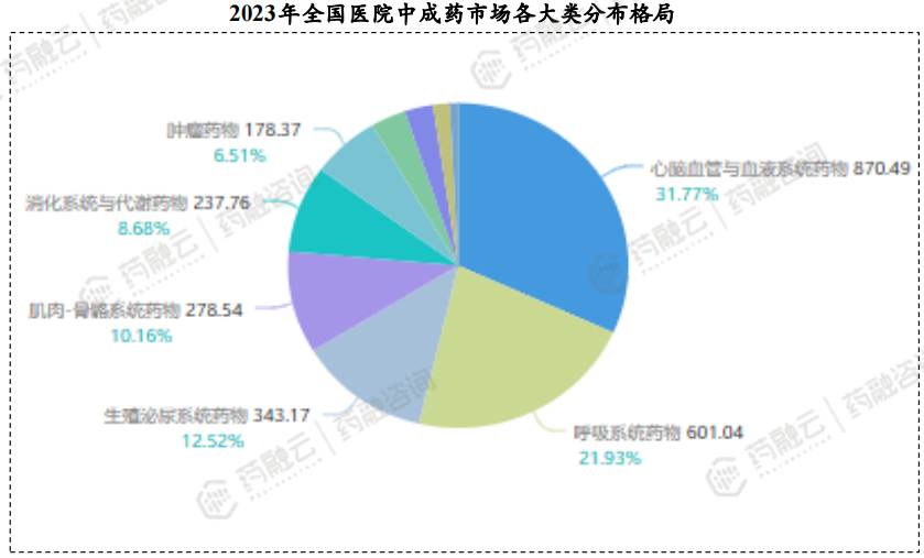 从细分领域分布来看,2023年中药市场的前五大用药类别依次为心脑血管与血液系统药物、呼吸系统药物、生殖泌尿系统药物、肌肉骨骼系统药物、消化系统与代谢药物,市场份额分别为31.77%、21.93%、12.52%、10.16%、8.68%。