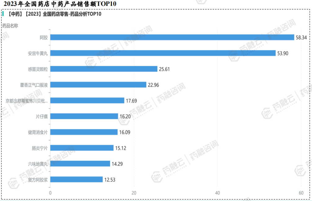 2023年全国药店中药销售额TOP10产品分别为:阿胶、安宫牛黄丸、感冒灵颗粒、藿香正气口服液、京都念慈菴蜜炼川贝枇杷膏、片仔癀、健胃消食片、肠炎宁片、六味地黄丸、复方阿胶浆。