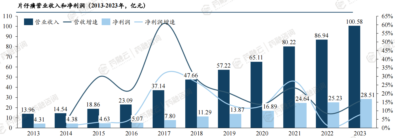 片仔癀药业是一家以医药制造为主业的中华老字号企业,公司收入规模快速增长,盈利能力强。公司营业收入从2013年的13.96亿元增长至2023年的100.58亿元,年复合增长率为21.83%;净利润从2013年的4.31亿元增长至2023年的28.51亿元,年复合增长率为20.80% ;2023年利润率为28.35%,盈利能力较强。