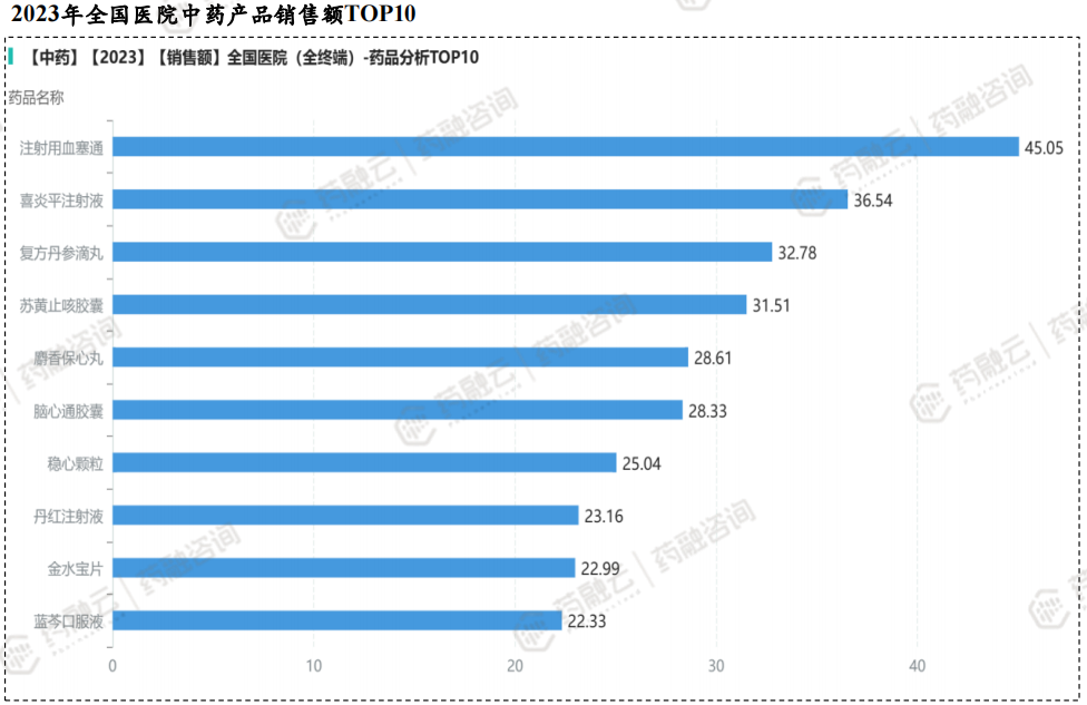 据摩熵医药全国医院(全终端)数据库统计,2023年全国医院中药产品销售额TOP10产品分别为:注射用血塞通、喜炎平注射液、复方丹参滴丸、苏黄止咳胶囊、麝香保心丸、脑心通胶囊、稳心颗粒、丹红注射液、金水宝片、蓝芩口服液。