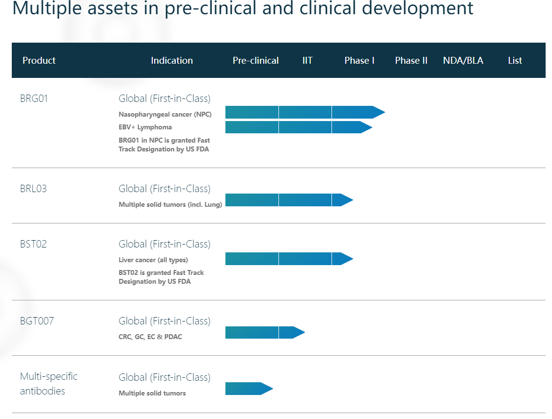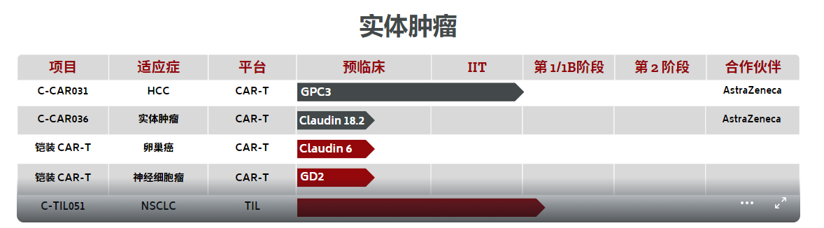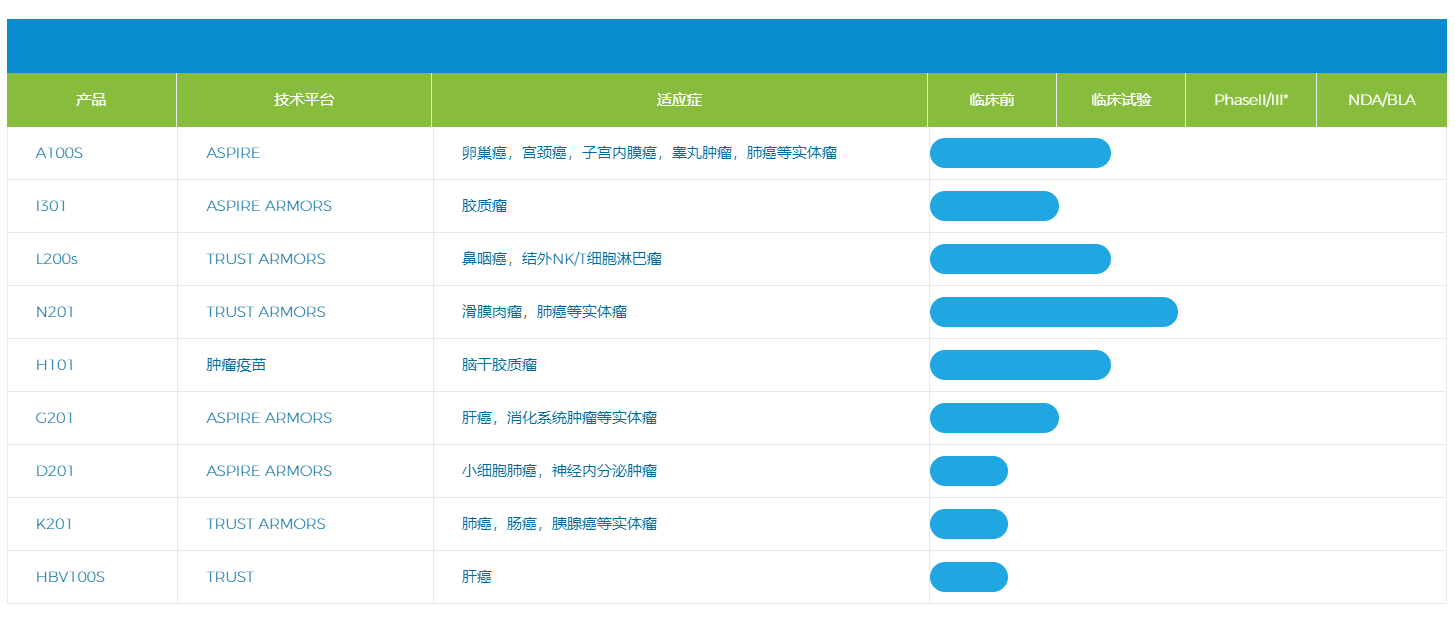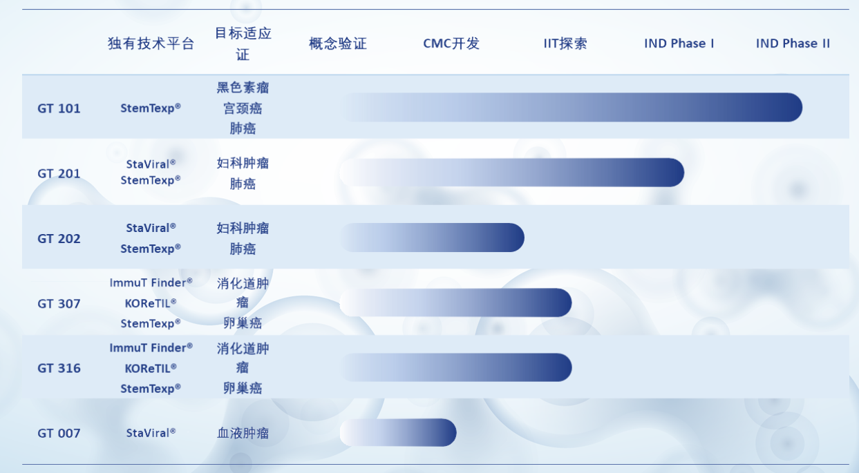公司的核心研发平台包括StemTexp®干性TIL扩增技术平台、StaViral®病毒稳转株工艺、ImmuT Finder®免疫调节靶点发现平台、KOReTIL®高效基因敲除系统,并依托平台开发了一系列下一代基因编辑型TIL药物。目前其管线中有6款TIL药物,靶向黑色素瘤、宫颈癌、肺癌、卵巢癌、消化道肿瘤等多种实体瘤。