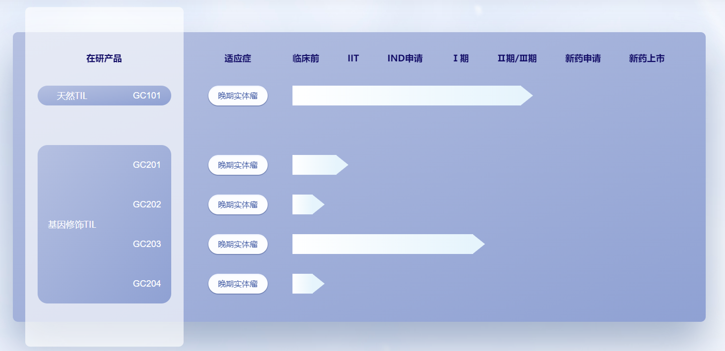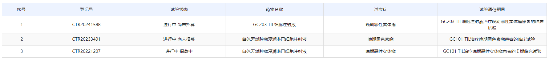 目前公司已有2款创新型TIL疗法(GC101、GC203)进入临床试验阶段,在9种不同类型晚期实体肿瘤中均展现优异临床疗效(包括多线治疗失败的胰腺癌与高级别脑胶质瘤),其中7例患者肿瘤被完全清除,无瘤生存最久时间已近3年。