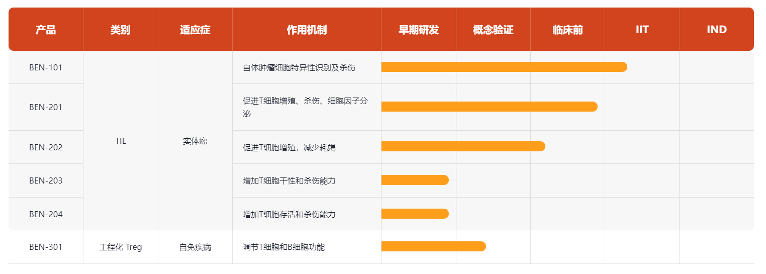 毕诺济成立于2021年,专注于细胞治疗领域,主攻肿瘤和自身免疫疾病领域的全球创新细胞疗法。其自主研发的自体肿瘤浸润淋巴细胞(TILs)注射液BEN101的适应症为晚期复发或转移性实体瘤(卵巢癌、宫颈癌、肾细胞癌和尿路上皮癌),现在处于IIT研究阶段。此外还有多款针对实体瘤的TIL疗法正处于临床前期。