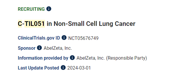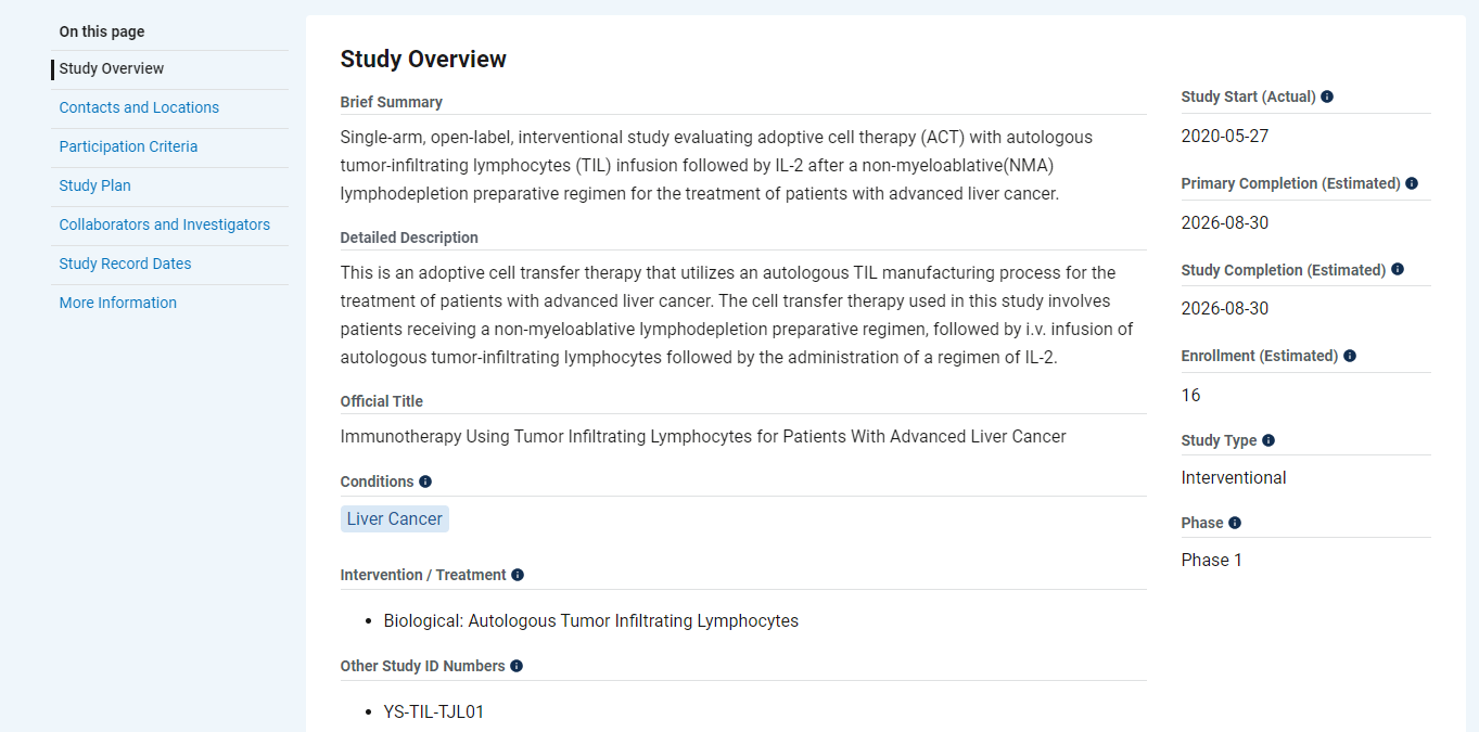 武汉长生科技开发的TIL细胞疗法,目前在进行IIT临床试验(NCT06084299),用于治疗晚期肝癌患者,试验于2023年10月16日开始招募受试者,试验预计2026年8月30日完成。