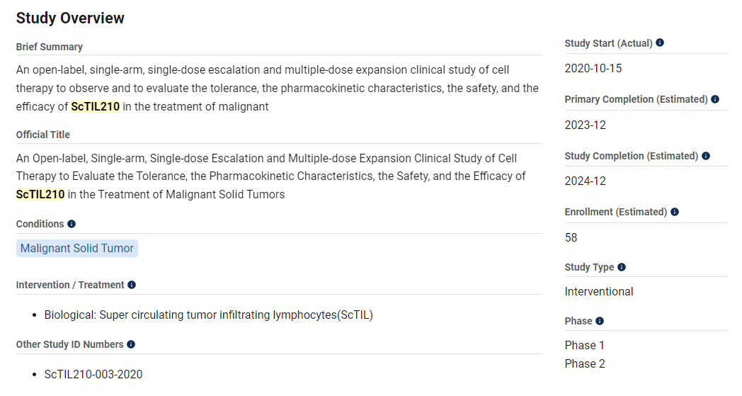 ScTIL210是卡替医疗在传统TIL疗法基础上开发的第四代TIL,无需借助手术组织获取TIL细胞,而是从外周血采集单核细胞,分离肿瘤识别性T细胞——从而大大提升了治疗实施的便捷性,并进一步给予基因修饰,提升其克服肿瘤微环境和增加自我扩增的能力。目前由上海东方医院李进教授、北京肿瘤医院郭军教授、北京协和医院赵海涛教授、郑大一附院张毅教授等知名研究者领导的超强型TIL的用于不同实体瘤适应症的、甚至不限癌种的新一轮临床研究正在进行中。