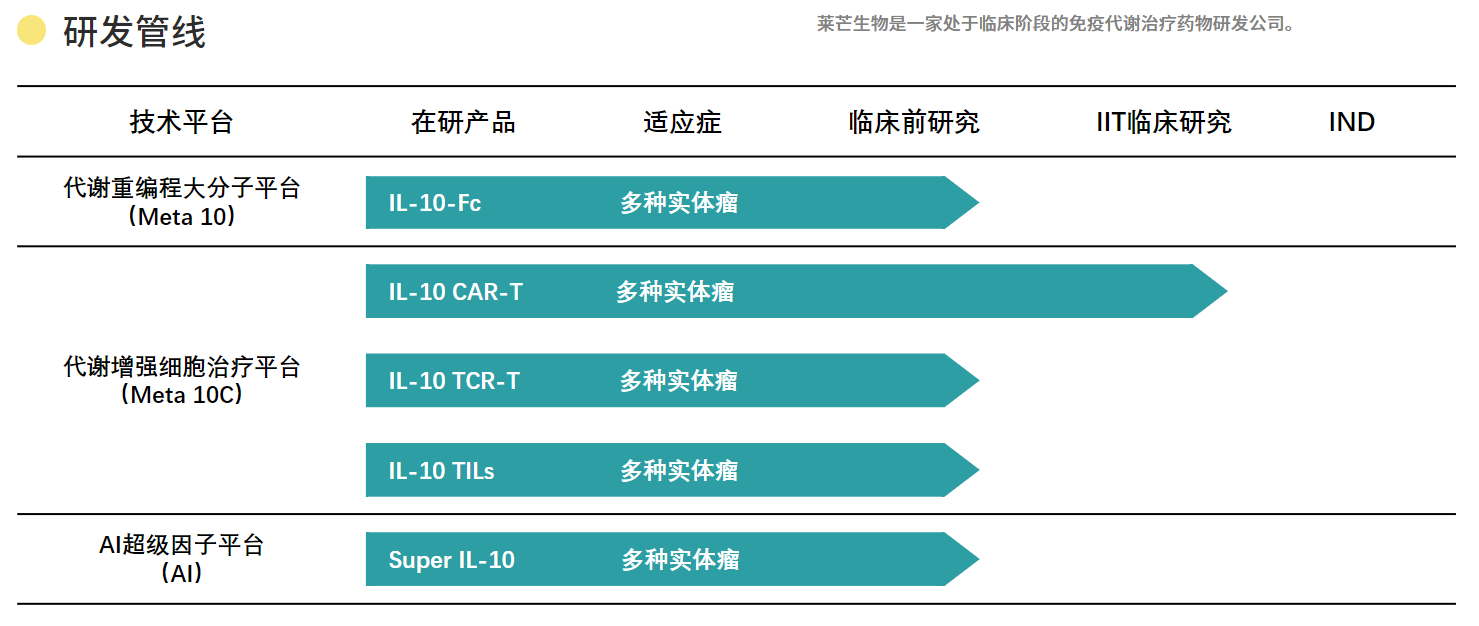 利用其代谢增强细胞治疗平台,莱芒生物管线中有两款TIL疗法在研,适应症为多种实体瘤,目前均处于临床前阶段。