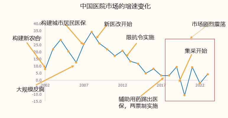 2009年起,我国开始推行新一轮医改,新医改制定了一系列的措施打击腐败、控制药价、防止不合理用药和过度用药等行为,医药市场的增速开始逐年放缓,2010-2015年的平均增长率下降至15.0%,相比2005-2010年足足下降了8个百分点。在此期间,药品销量开始放缓,药价也开始出现了下降,市场增速快速下降,2015年的医院市场增速下降至4.9%,相比2012年整整下降了16个百分点。