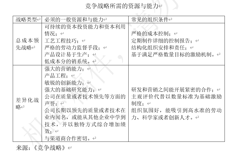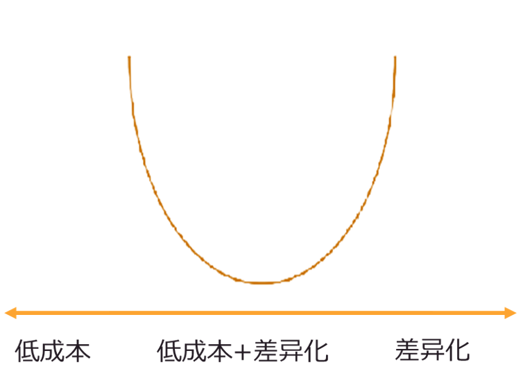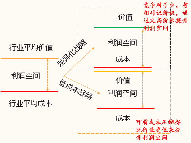 进入到行业转型期,快速增长的市场如同踩下了急刹车、甚至挂上了倒挡,企业原有的模式不再适合继续发展,所以大部分企业都要面临战略转型,从新培养核心竞争力。根据迈克尔▪波特的《竞争战略》,企业如果实现了“低成本”或“差异化”,利润水平就能增加(避开了行业的大流),但不论是“低成本”还是“差异化”都是有基础的知识与技能要求的,而且两者只能二选一(两者都选会回归行业大流,利润反而最低,如上图所示),朝着一个方向发展核心竞争力。