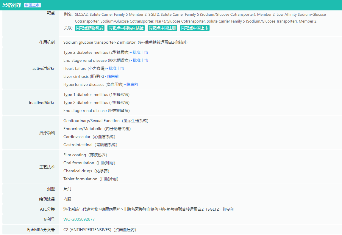恩格列净(Jardiance, Empagliflozin)由勃林格殷格翰和礼来联合开发的钠-葡萄糖协同转运蛋白-2 (SGLT2)抑制剂,于2014年8月获FDA批准上市,用于控制2型糖尿病成人患者的血糖和降低患者的心血管风险。2017年,在中国获批上市,商品名“欧唐静”。其已获得60多个国家指南共同推荐。