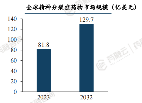 全球精神分裂症药物市场空间有望超百亿美元。据Expert market research估计,全球精神分裂症药物的市场规模将由2023年的81.8亿美元增长至2032年的129.7亿美元,年复合增长率将达5.26%。药融云数据显示,2019-2023Q1-3年我国抗精神病药物销售额分别为107.43、92.34、92.64、89.67、66.08亿元。