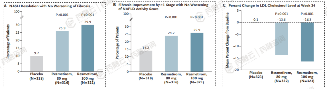 主要终点( NASH缓解且无纤维化进展):Resmetirom组NASH缓解且无纤维化进展的受试者比例显著高于安慰剂组(80 mg组,100 mg组和安慰剂组受试者比例分别为25.9%,29.9%和9.7%,组间差异有统计学意义)。
