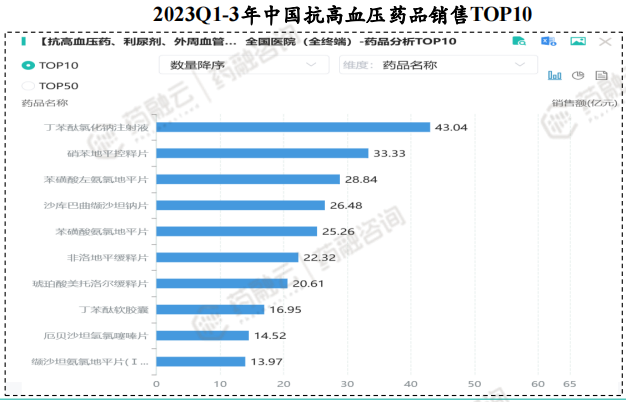 全球及国内高血压药物市场规模广阔,据贝哲斯咨询数据2023年全球高血压药物市场规模为250.61亿美元,预计2023-2028年该市场将以3.47%的复合年增长率增长。根据药融云数据库,2023Q1-3年我国抗高血压药物全国医院销售额为544.14亿元;其中,全国医院销售端药品销售TOP10中,丁苯酞氯化钠注射液销售额为43.04亿元,位列榜首。
