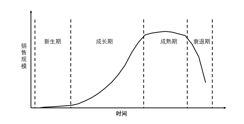 行业的生命周期指行业从出现到完全退出社会经济活动所经历的时间,根据先后顺序可依次分为导入期(又称新生期)、成长期、成熟期和衰退期四个阶段。行业生命周期依据行业销售额增长的拐点进行区分,通常符合S型曲线,但也可能因技术、经济、政策、文化等宏观环境因素影响,跳过某阶段而直接进入下一阶段,也可能衰退后再次成长。