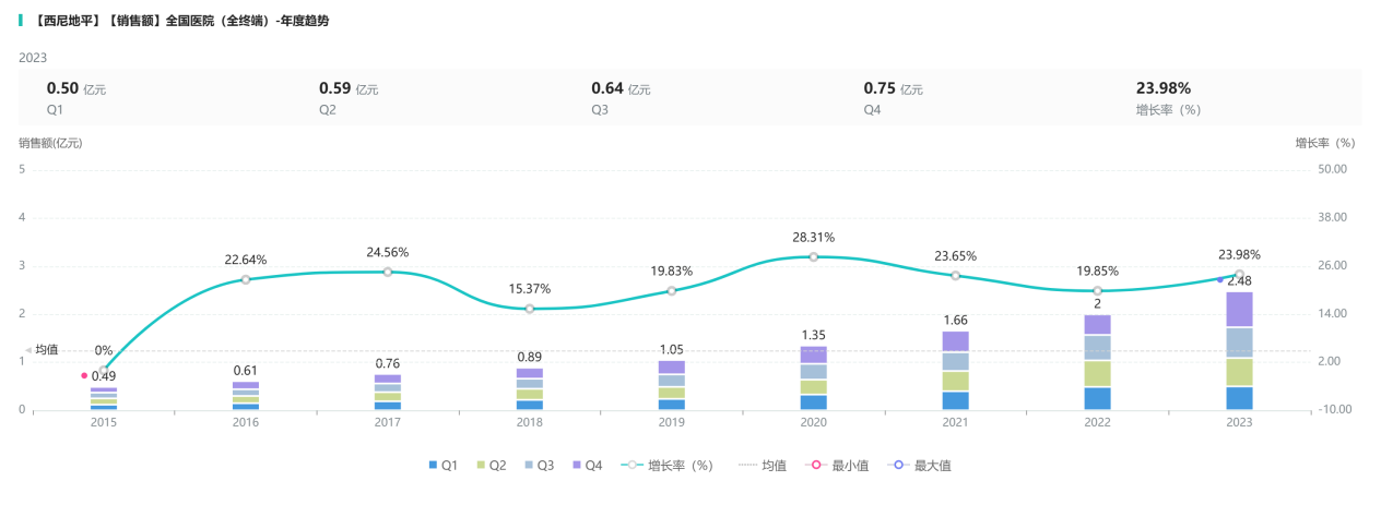 选取各代表药物结合药融云数据库分析可以看出,沙库巴曲缬沙坦、西尼地平以及达格列净在我国公共医疗市场销售额都逐年增加(图7-9)。其中沙库巴曲缬沙坦增长最为突出,2023年相较前年销售额增长50.68%,可能与新版指南将ARNI列为新型高血压常用药有关。