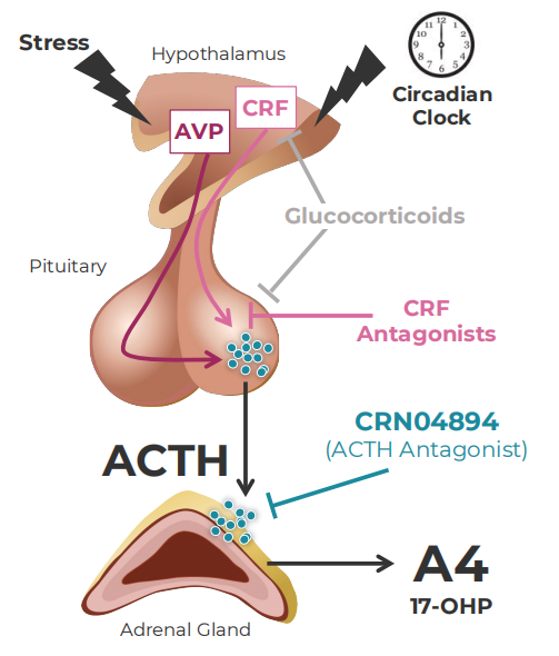 CRN04894是一种口服给药的非肽类小分子ACTH拮抗剂,用于治疗ACTH(促肾上腺皮质激素)依赖性库欣综合征、先天性肾上腺皮质增生症(CAH)和其他ACTH过量疾病。ACTH依赖性库欣综合征是由垂体瘤引起的,垂体瘤分泌过多的促肾上腺皮质激素,进而导致肾上腺皮质醇的下游合成和过度分泌,皮质醇是人体的主要压力荷尔蒙,过量会导致死亡率和发病率显着增加。症状包括体重增加、脂肪沉积、皮肤变薄、容易瘀伤和疲劳等。先天性肾上腺皮质增生症是由于肾上腺类固醇激素生物合成过程某种酶先天性缺陷导致的常染色体隐性遗传性病,90%~95%的CAH病例为21-羟化酶缺乏症。临床表现谱系广泛复杂,主要为肾上腺皮质功能减退,部分患儿伴有电解质紊乱及性发育异常。