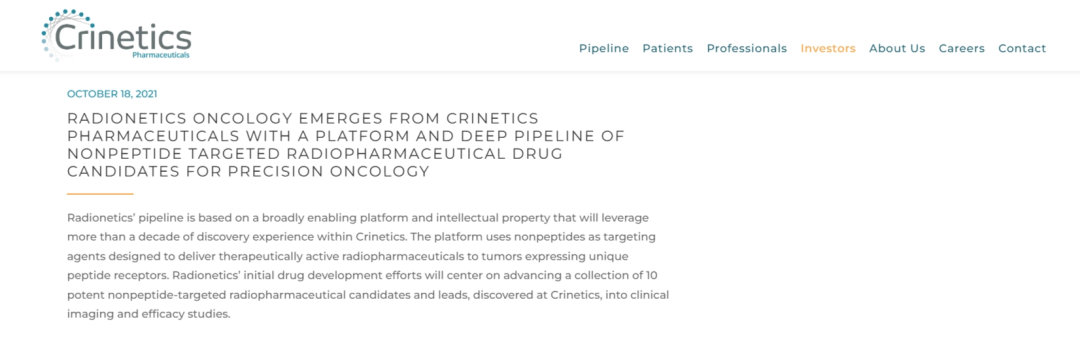 基于上述目的,2021年10月,Crinetics宣布与5AM Ventures和Frazier Healthcare Partners共同创立一家独立运营的新公司——Radionetics Oncology,旨在开发用于治疗各种肿瘤适应症的新型靶向非肽类放射性药物的深度管线。Radionetics的产品线基于一个广泛的平台和知识产权,利用Crinetics十多年的发现经验,公司平台使用非肽作为靶向剂,旨在向表达独特肽受体的肿瘤递送具有治疗活性的放射性药物。在公司成立的同时,Radionetics获得了Crinetics放射治疗技术平台的全球独家许可和相关知识产权,以换取股权、超过10亿美元的里程碑和净销售额的个位数特许权使用费,Radionetics以3000万美元的私募融资启动,5AM Ventures和Frazier Healthcare Partners是独家投资者,同时Radionetics还会和Crinetics进行研究合作,以确定多个其他靶点的候选药物。2024年6月底,Radionetics Oncology宣布与礼来达成战略合作,将共同推进靶向GPCR的小分子放射性药物,礼来向其注入1.4亿美元的前期资金。同时礼来保留了在未来以10亿美元收购Crinetics衍生产品的选择权,进一步巩固了双方的战略伙伴关系。