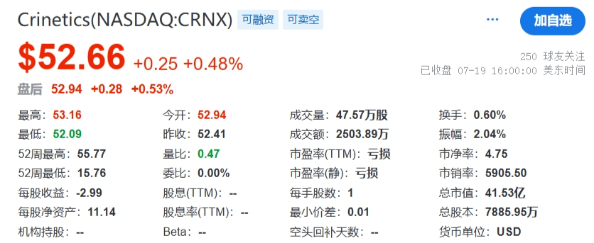 2024年2月,Crinetics宣布同意以每股42美元的价格向机构和认可的医疗保健投资者私募出售830多万股股票,总收益预计为3.5亿美元。融资包括新投资者和现有投资者的参与,包括Adage Capital Partners L.P.、Driehaus Capital Management、EcoR1 Capital、First Light Asset Management、GordonMD Global Investments LP、Invus、Janus Henderson Investors、Paradigm BioCapital、Perceptive Advisors、Rock Springs Capital以及多家领先的共同基金。公司计划将这些资金用于临床阶段候选产品的研发、其他研究项目、营运资金和一般企业用途。截止2024年7月19日,Crinetics公司市值41.53亿美元,约合人民币300亿。截止发稿前(7月31日收盘),市值为41.89亿美元,每股53.12美元。