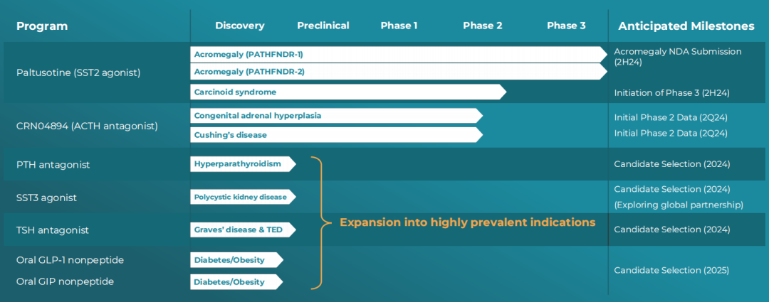 Crinetics的研发管线专注于治疗内分泌疾病和相关肿瘤的小分子口服药物,具体管线的进展情况如下所示: