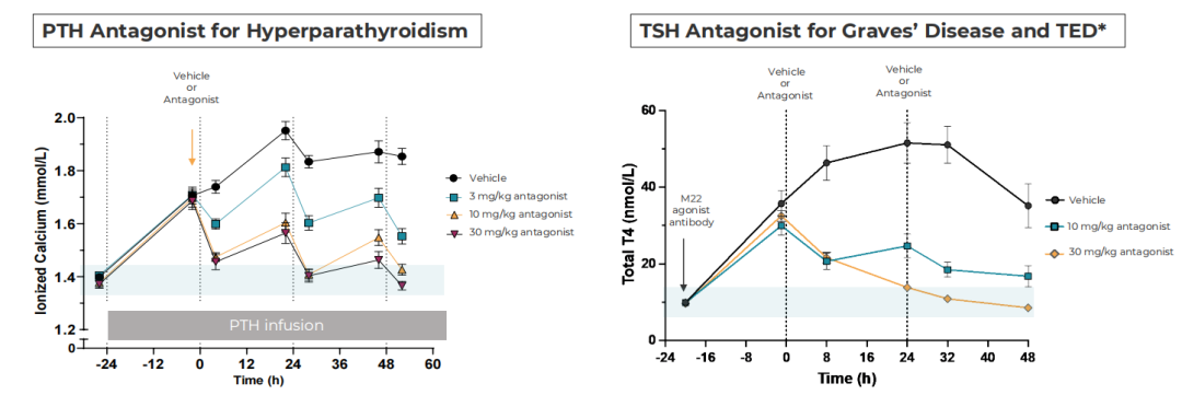 除了以上两个管线外,Crinetics的其他管线目前均处于开发阶段,包括针对甲状旁腺功能亢进的甲状旁腺激素拮抗剂、针对多囊性肾病的SST3激动剂、针对格雷夫斯病和TED(甲状腺眼病)的TSH拮抗剂、以及针对糖尿病/肥胖的口服GLP-1/GIP非肽。预计甲状旁腺激素拮抗剂和TSH拮抗剂这两个新项目会在2024年开始首次人体研究,并在2025年进入临床开发阶段。以上是两个项目的临床前疗效数据。
