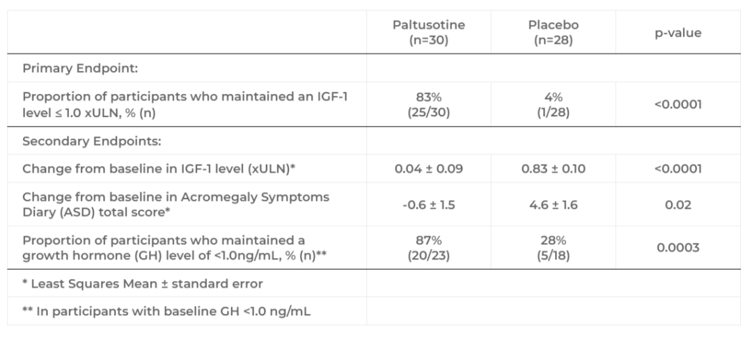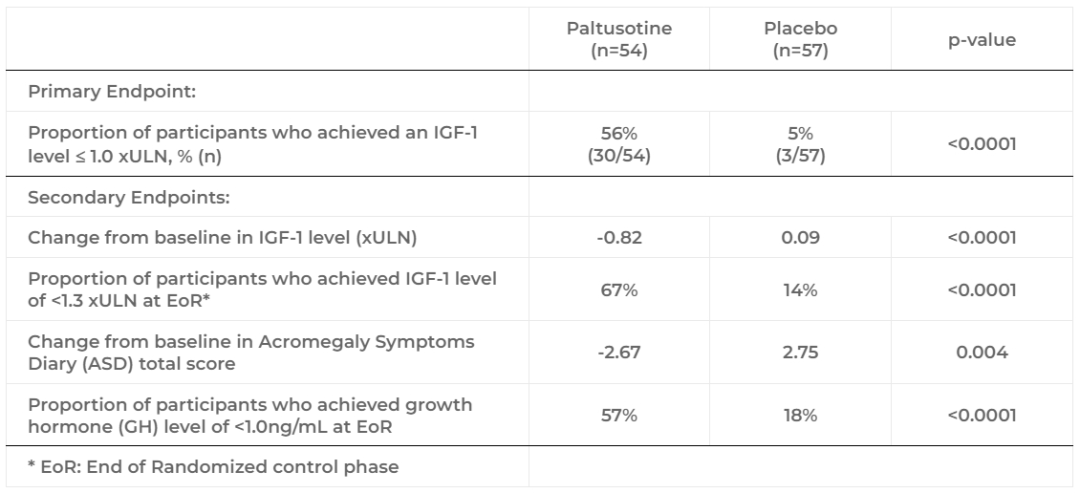 PATHFNDR-2试验是一项为期24周的随机双盲、安慰剂对照治疗,该试验在111名未接受药物治疗的肢端肥大症患者中进行,评估Paltusotine与安慰剂相比的疗效和安全性。2024年3月,公司报告了PATHFNDR-2试验的顶线结果,结果显示,该试验达成主要终点,接受paltusotine治疗患者(56%)24周后达到胰岛素样生长因子1(IGF-1)水平≤正常值上限(xULN)1.0倍的比例显著高于安慰剂组(5%,p<0.0001)。所有次要终点也均达到统计学意义,具体结果如下表所示: