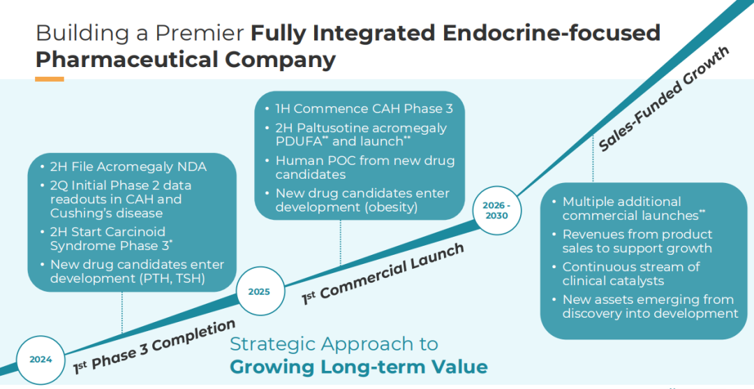 截至2024年3月31日,Crinetics的非限制性现金、现金等价物和投资总额为9.010亿美元,2023年年底只有5.586亿美元,在2024年2月28日,Crinetics进行了私募股权融资,募集资金总额约为3.5亿美元。根据目前的预测,预计其现金、现金等价物和短期投资将足以为公司到2028年的运营计划提供资金。当然,如果公司最先进管线有望在明年推出,公司就有望在明年之后实现收入增长,并能够接连推进其他管线的进展,以下是Crinetics到2030年预期的战略情况: