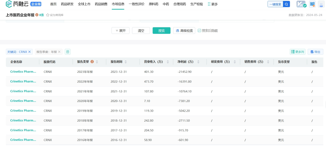从药融云数据库获悉,Crinetics整体亏损在逐年增加,从公司报告的管线结果来看,公司逐年增加的投入似乎在近两年会有所回报。
