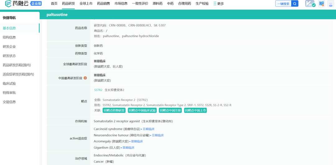 Paltusotine是一种口服非肽类、选择性靶向生长抑素受体2型(SST2)的激动剂,正在开发用于治疗肢端肥大症和类癌综合征。目前Crinetics已完成了肢端肥大症的临床试验3期研究和类癌综合征的临床试验2期研究。预计2024年下半年提交针对肢端肥大症的新药上市申请,与FDA确定PDUFA日期并有望在2025年下半年推出该产品。