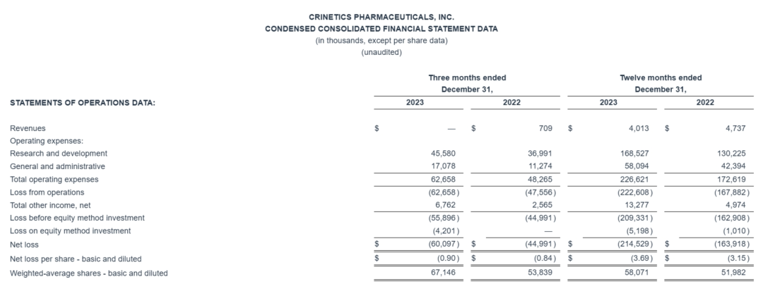 Crinetics在2023年度的研发费用为1.685亿美元,上年同期及1.302亿美元。一般及行政费用为5810万美元,上年同期为4240万美元。研发费用和行政费用的增加主要归因于人事成本的增加。2023年公司净亏损2.145亿美元,上年同期为1.639亿美元。2023年全年收入为400万美元,而2022年同期为470万美元。