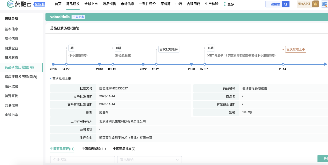 药融云数据监测显示:2023年11月14日,中国国家药品监督管理局(NMPA)批准伯瑞替尼肠溶胶囊(商品名:万比锐®)用于治疗具有间质-上皮转化因子(MET)外显子14跳变的局部晚期或转移性非小细胞肺癌患者(METex14 NSCLC)。