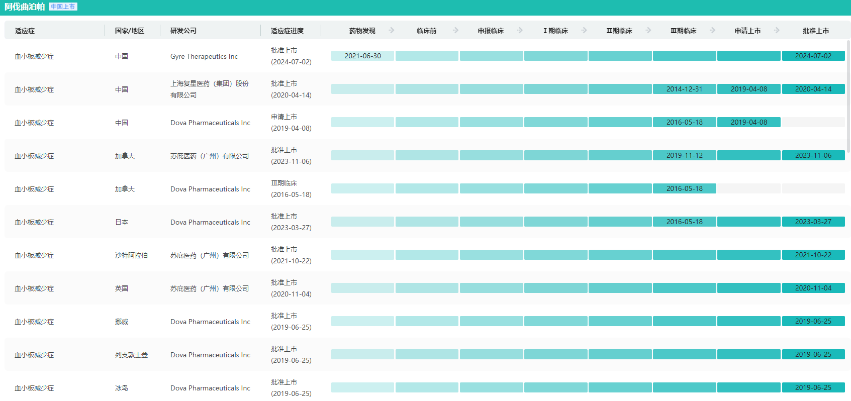 2018年3月,复星医药获得AkaRx公司关于该阿伐曲泊帕在中国大陆及香港特别行政区的独家开发及商业权利。2019年4月,阿伐曲泊帕获得NMPA授予优先审评资格。