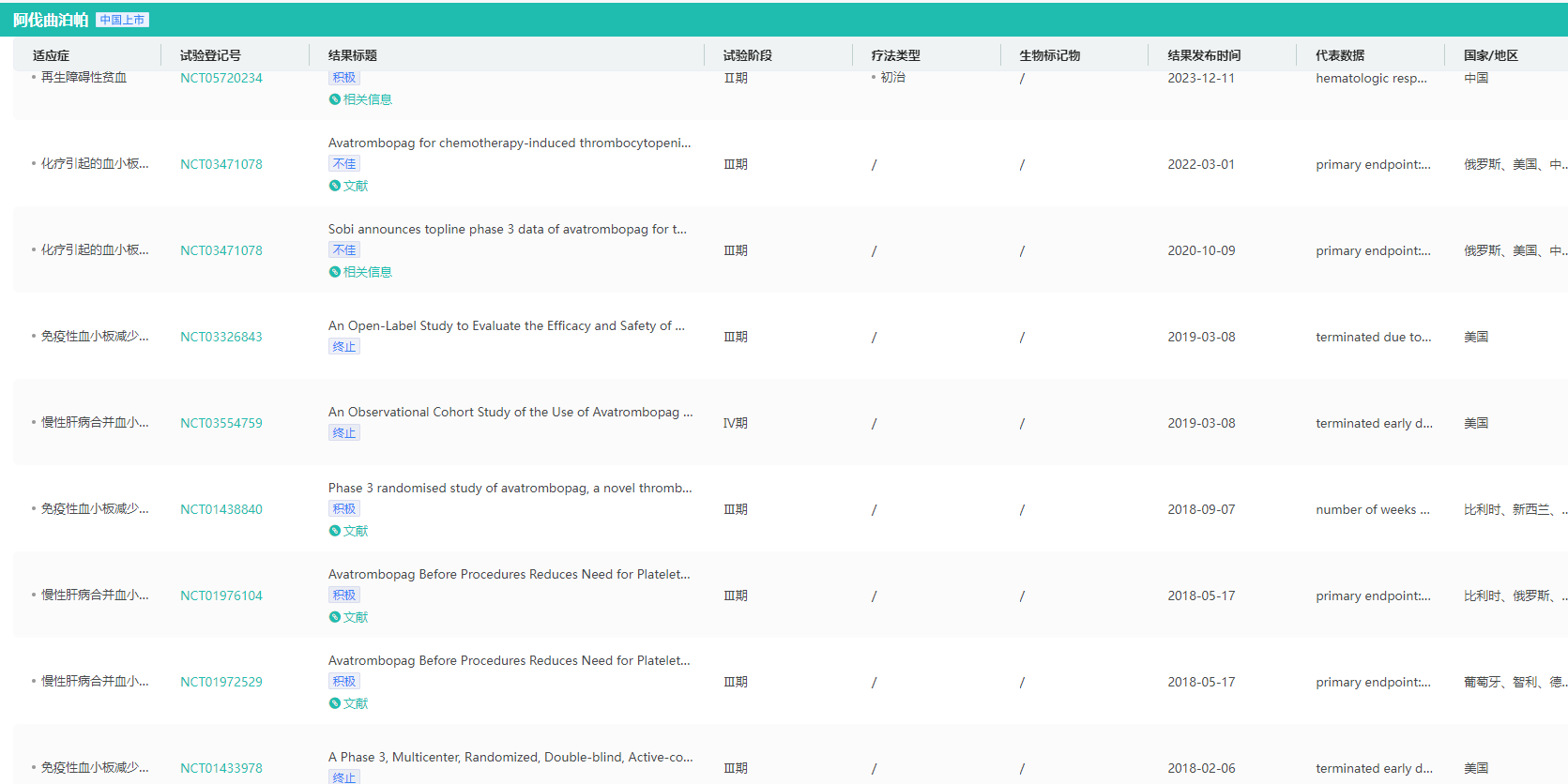 另外值得一提的是,原研针对阿伐曲泊帕在中国还进行了多项新适应症研究,除了免疫性血小板减少症(ITP),还有再生障碍性贫血(AA)和化疗相关血小板减少症(CIT)等。