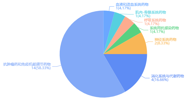 从ATC分类来看,其中,抗肿瘤药和免疫机能调节药物占比最高,共有18个,涉及多发性骨髓瘤、血管母细胞瘤或胰腺神经内分泌肿瘤、非小细胞肺癌、子宫内膜癌、树突状细胞和组织细胞肿瘤、神经纤维瘤、MSI-H/dMMR结直肠癌、弥漫性大B细胞淋巴瘤等适应症。
