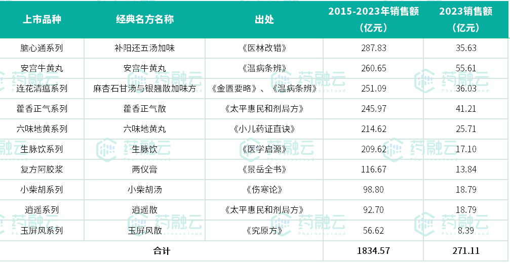 古代经典名方制剂以其悠久的历史和确切的疗效,展现出广阔的市场前景。药融云数据库显示,自2015年以来,10款源自古代经典名方的中成药销售总额已突破1800亿元。仅2023年,10款源自古方的销售额就突破270亿元,其中9款产品的销售额已超过10亿元,其中安宫牛黄丸、藿香正气系列、连花清瘟系列、脑心通系列4款产品的销售额均突破30亿元。