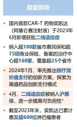 复星凯特主要从事肿瘤免疫细胞治疗产品的研发、生产和商业化。其首款、CAT-T细胞治疗产品奕凯达(阿基仑赛注射液)于 2021年6月获批在中国境内(不包括港澳台地区,下同)上市,成为国内首个获批上市的CAR-T细胞治疗产品。