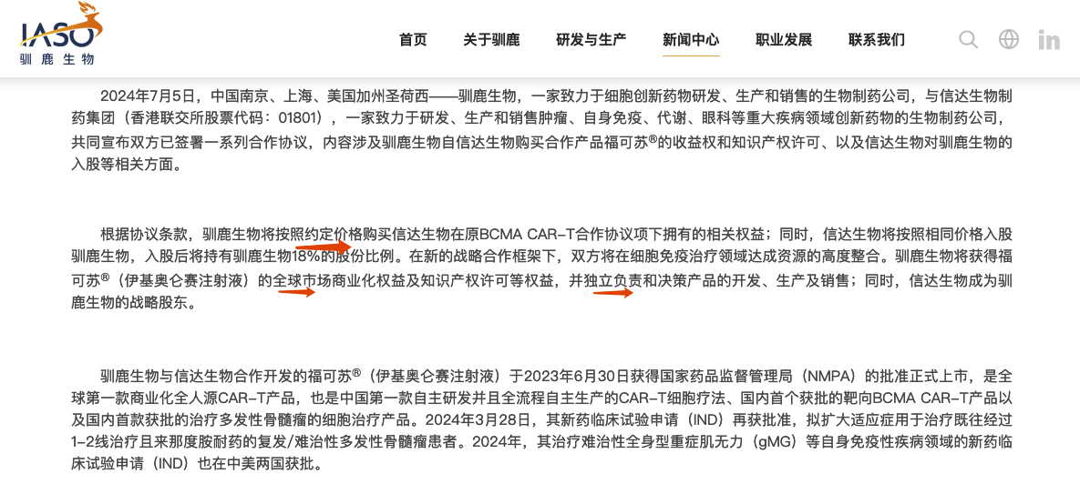 截止目前,中国市场批准的CAR-T细胞治疗的产品有复星凯特的阿基仑赛注射液、药明巨诺的瑞吉奥伦塞注射液、驯鹿生物的伊基奥仑赛注射液(信达生物成为驯鹿18%股东,驯鹿持有该产品全部权益)、合源生物的纳基奥仑赛注射液、科济生物的泽沃基奥仑赛注射液(与华东医药合作)、最新批准的南京传奇生物的西达基奥仑赛。(3款针对CD19靶点,3款BCMA靶点)