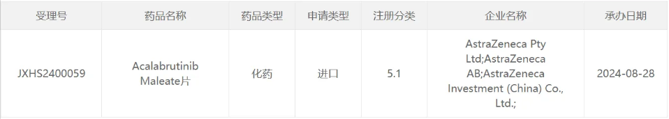 2023年3月,中国NMPA批准阿可替尼胶囊(acalabrutinib,商品名:Calquence/康可期)首次上市。用于治疗既往至少接受过一种治疗的成人套细胞淋巴瘤(MCL)患者,2023年8月,单药适用于既往至少接受过一种治疗的成人慢性淋巴细胞白血病(CLL)/小淋巴细胞淋巴瘤(SLL)患者,第2项适应症在中国获批;2024年8月28日,中国CDE官网最新公示,阿斯利康申报的acalabrutinib(通用名:阿可替尼胶囊,商品名:康可期)上市申请已获得受理:推测此次阿可替尼申报上市的新适应症可能是一线治疗慢性淋巴细胞白血病(CLL)。