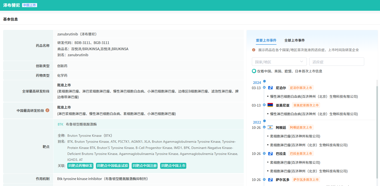 2024年3月7日,百济神州宣布FDA加速批准Brukinsa与抗CD20单克隆抗体obinutuzumab联用,用于治疗复发或难治性(R/R)滤泡性淋巴瘤(FL)成人患者,经过两个或多个疗程后的全身治疗。