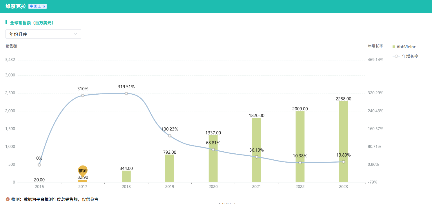 Venclexta近几年维持了较好的增长势头,2023年达到了22.88亿美元,同比增长13.9%。Venclexta(维奈克拉)增速稳定,上半年销售额达到12.51亿美元,同比增长16%。预测2028年该药物销售额33.44亿美元。