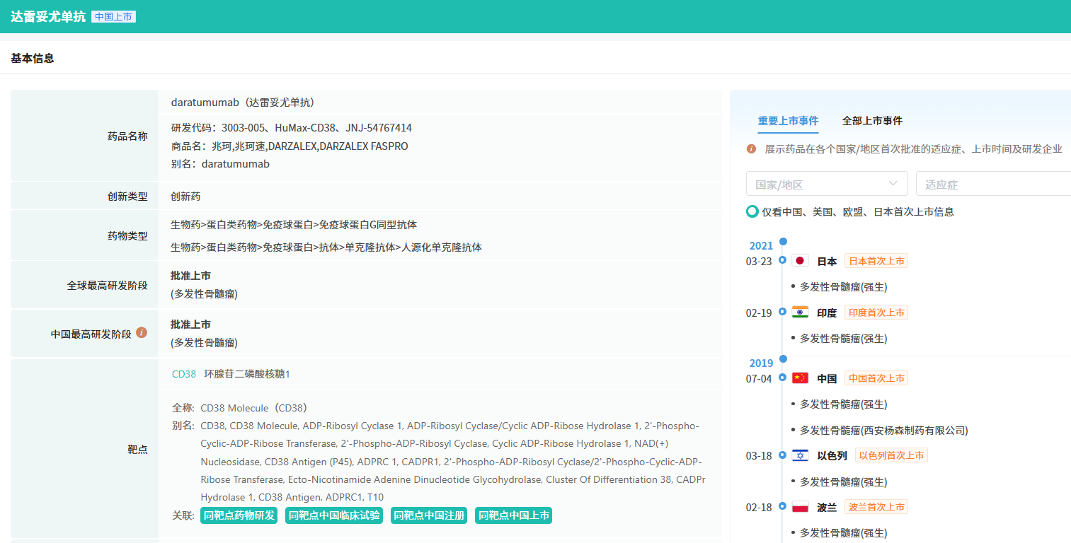据药融云数据库显示,Darzalex(达雷妥尤单抗)是一种抗CD38单克隆抗体,能结合多发性骨髓瘤细胞上的CD38并激活免疫系统,从而杀伤肿瘤细胞,主要用于多发性骨髓瘤的治疗。Darzalex也是全球首个靶向CD38的药物。