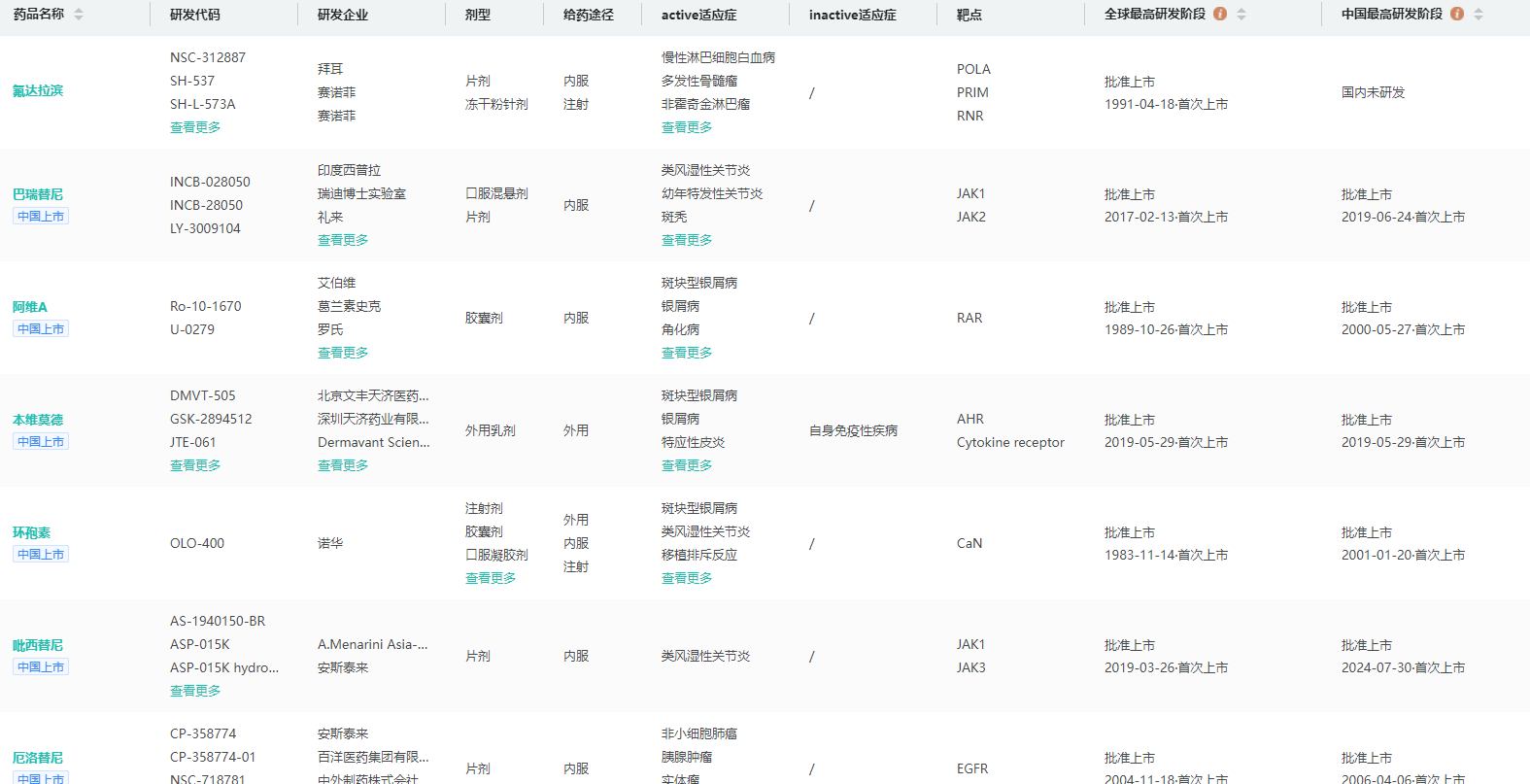 全球获批的银屑病小分子药物查询(部分展示)