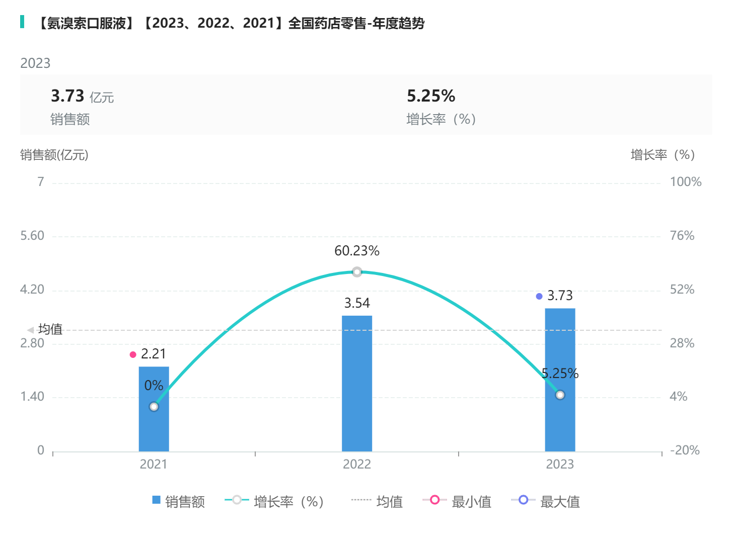 氨溴索口服液在2021-2023年间药店销售额逐年上升,在2022年增长率最高,达到60.23%,详见图5。